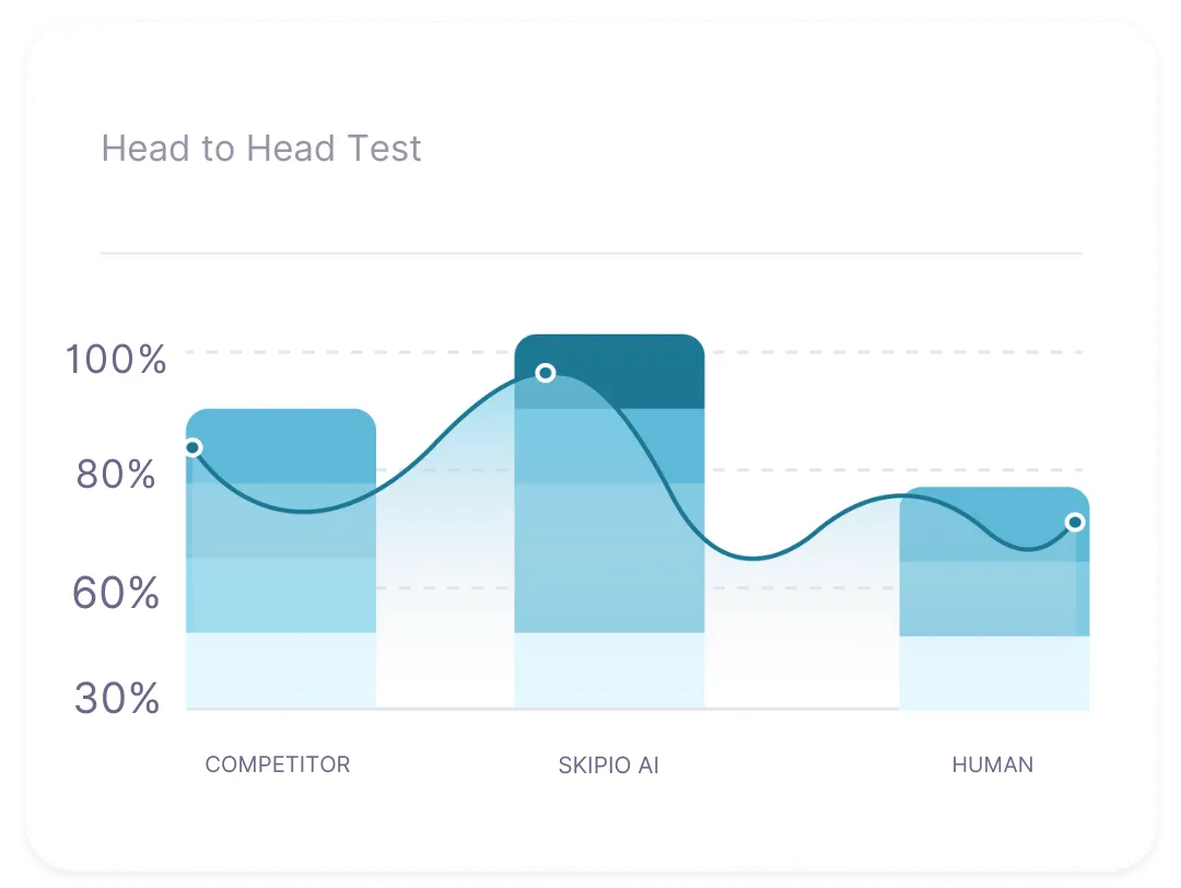 With an average sentiment rate of 95%, Skipio resolves more customer questions than any other AI Agent. In every head-to-head test, Skipio wins
